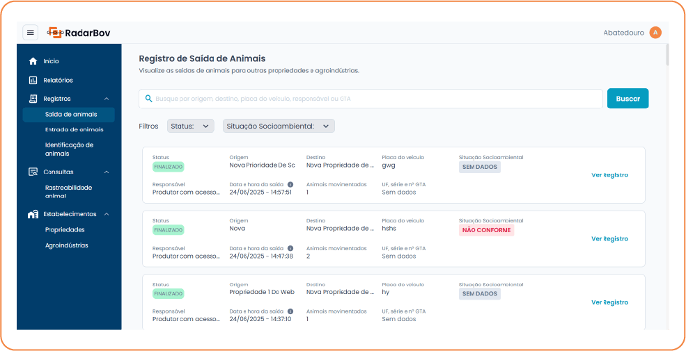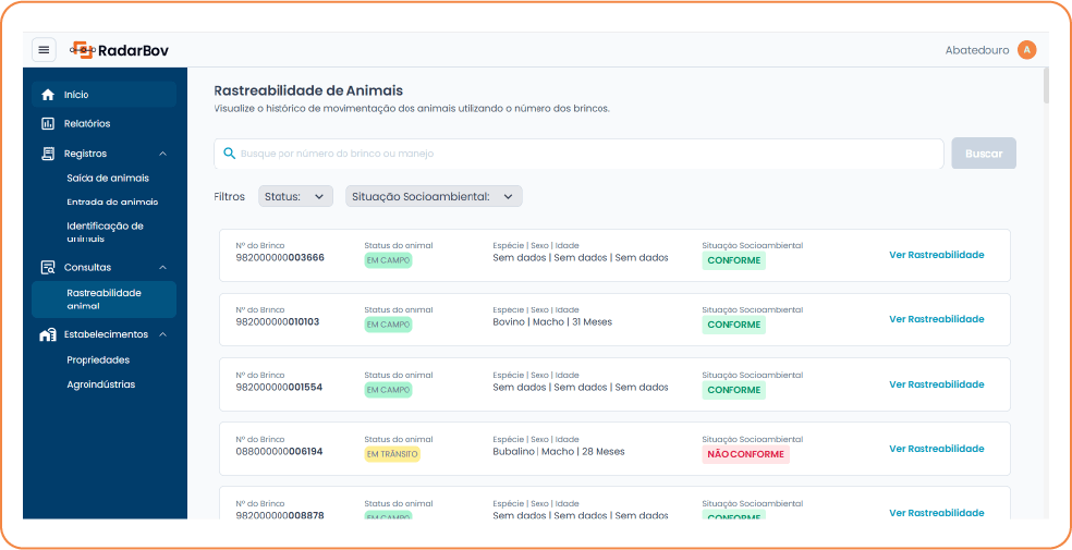 O sistema gera ocorrências automáticas em casos de inconformidades, oferecendo uma visão clara da procedência e da confiabilidade do rebanho.